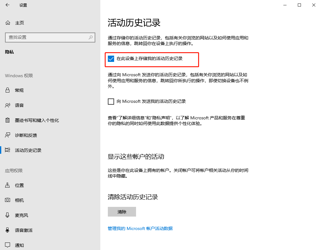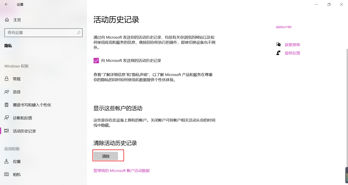 第四步,接着在窗口右侧的【活动历时记录】界面当中,找到【清除历时记录】选项下方的【清除】按钮,点击即可进行任务视图记录的删除了。