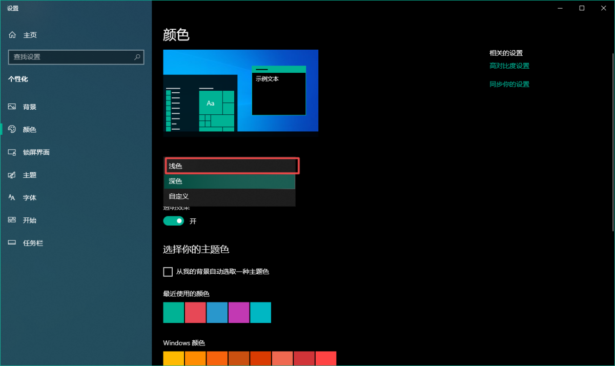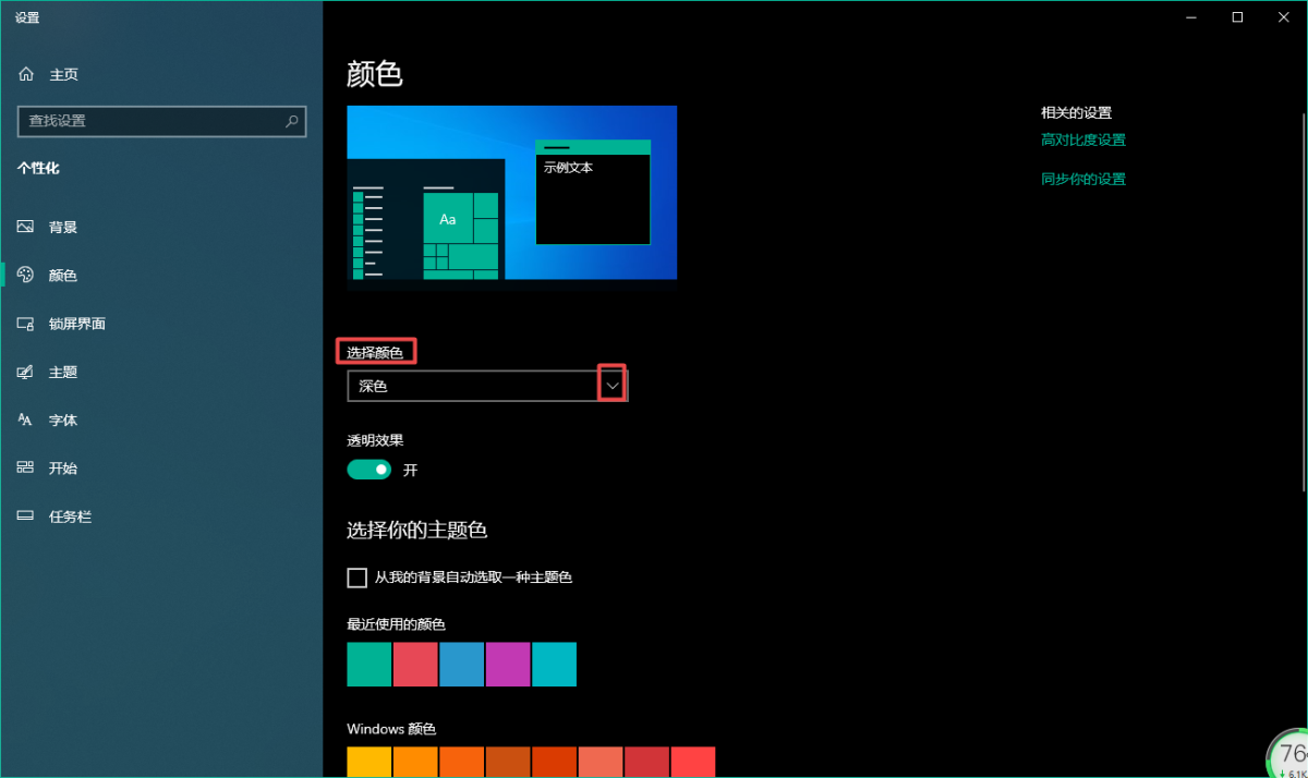 第三步,然后在界面的右侧,找到【选择颜色】一栏,然后点击【深色】选项右侧的下拉按钮。