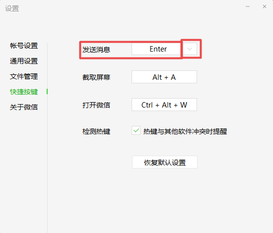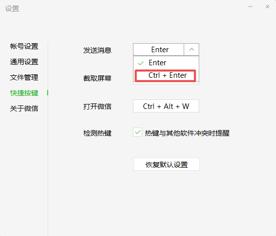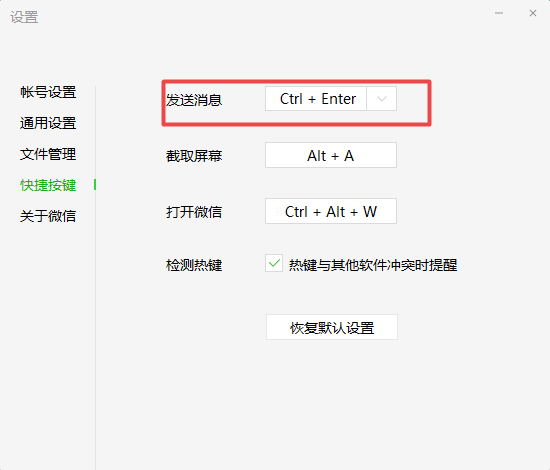 第四步,然后我们将微信的发送消息的快捷按键设置为【Ctrl+Enter】按键。