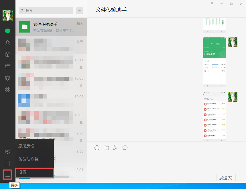 第一步,在电脑上打开微信,进入到微信的主界面当中后,找到界面左下角的【三】更多图标,并点击它,然后在弹出的选项中,选择【设置】选项。