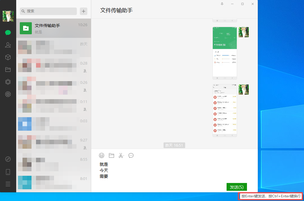 第五步,最后回到微信的界面中,找到想要发送消息的好友,然后输入我们想要发送的文字内容,然后按下【Enter】键,就可以实现换行而不发送内容了。