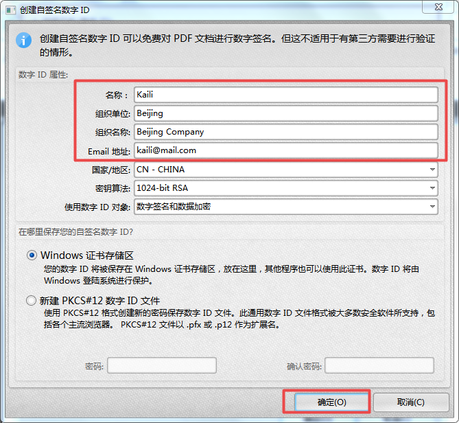 第七步,进入到创建自签名数字界面后,我们根据自己的需求,按照界面上的提示,来创建自己所需要的签名就可以了,签名信息填写完成后,点击界面下方的【确定】按钮就可以了。