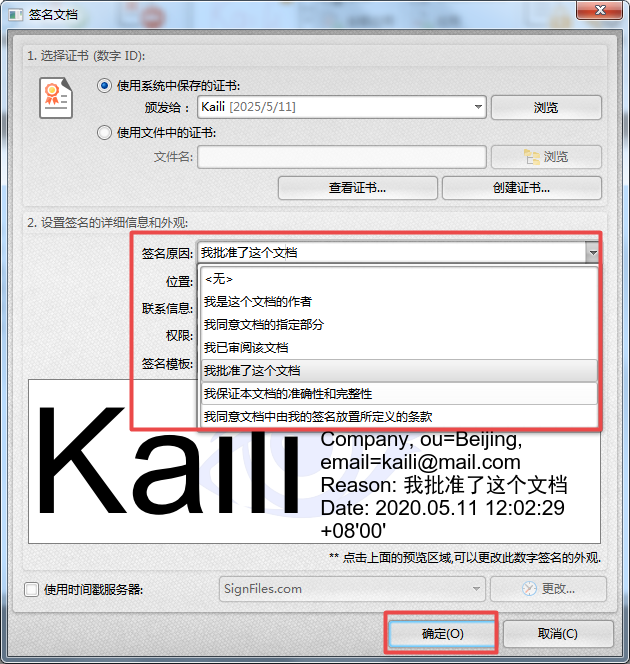 第九步,签名的详细信息和外观全部设置完成后,我们点击界面上的【确定】按钮。