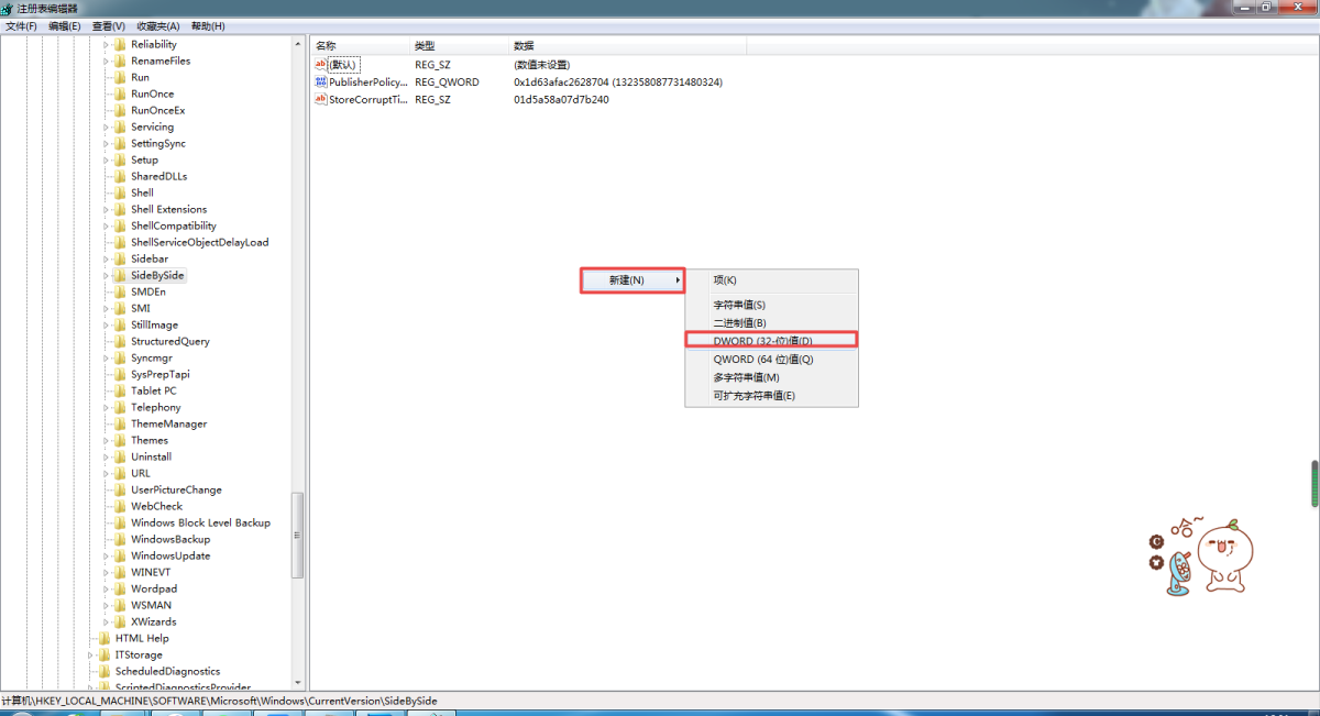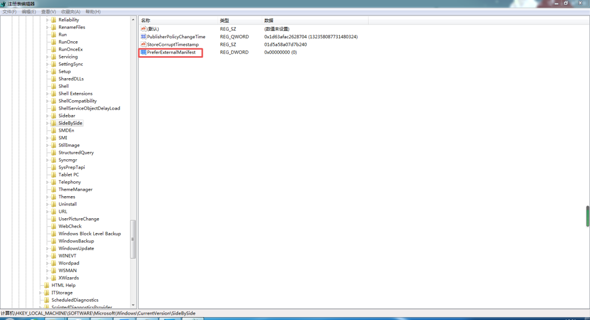 进入到电脑的注册表编辑器界面后,接着我们在此界面当中,进入到【HKEY_LOCAL_MACHINE\SOFTWARE\Microsoft\Windows\CurrentVersion\SideBySide】这个路径当中。接着在窗口界面的右侧,按下鼠标右键,然后新建一个名为【PreferExternalManifest】的DWROD(32位)值,并将其数值数据设置为1。