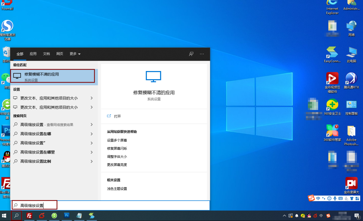 如果没有显示这个提示信息的话,那么就在电脑的任务栏的搜索框当中,输入【高级缩放设置】并选择【修复模糊的应用】。