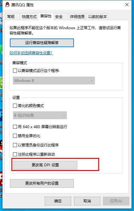 接着在弹出的【属性】窗口当中,选项界面上方的【兼容性】选项卡,进入到相关设置界面后,我们点击界面下方的【更改高DPI设置】按钮。