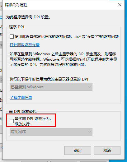 进入到【为此程序选择高DPI设置】界面当中后,我们在【高DPI缩放替代】一栏的下方,勾选【替换高DPI缩放行为】选项。