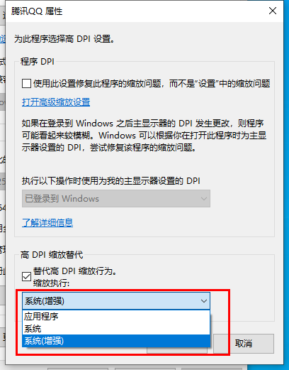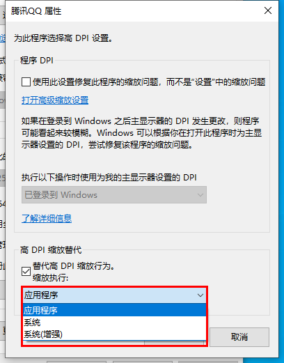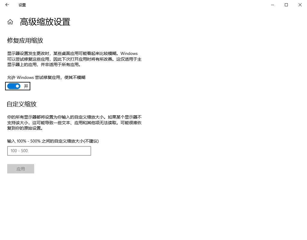 然后将这个选项调整为【应用程序】选项,就可以有效的缓解缩放导致的应用程序显示虚化的问题了。