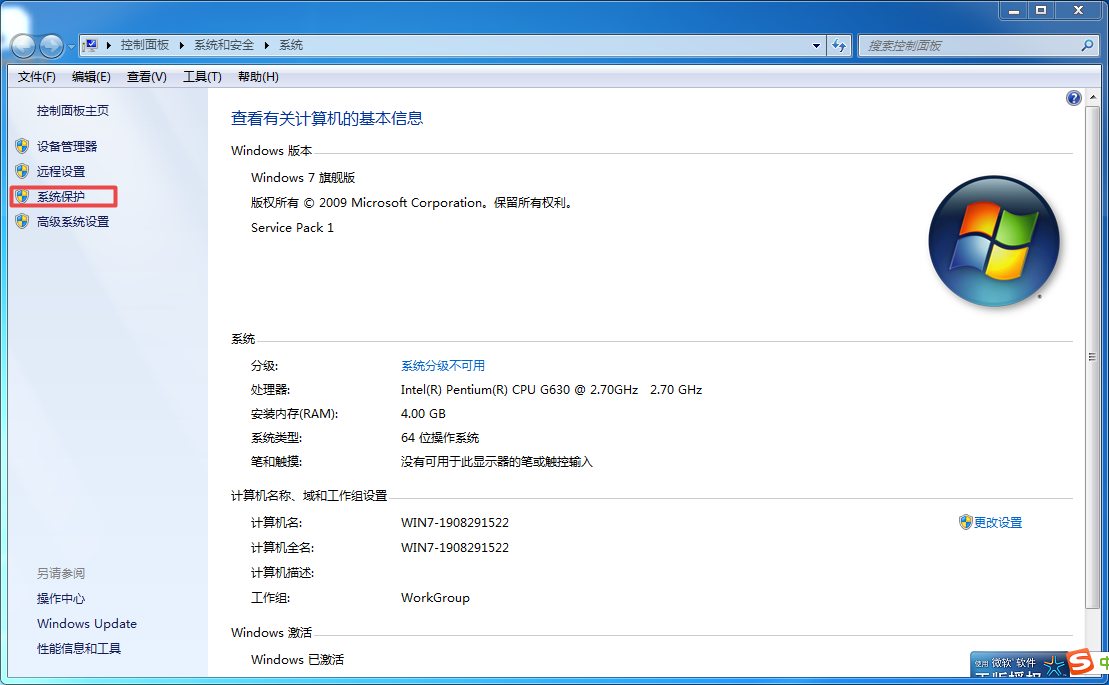 第二步,然后电脑就会弹出【控制面板的系统】窗口了,在此界面的左侧,我们找到【系统保护】选项,并点击打开。