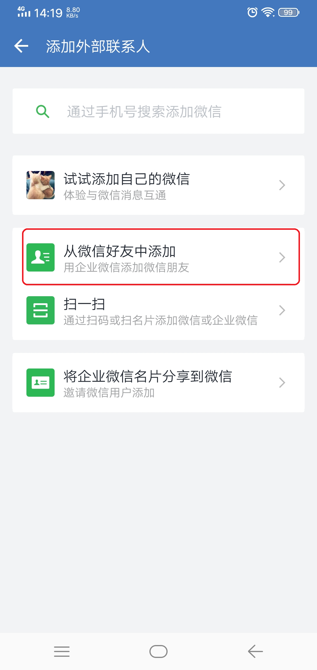第四步,进入到添加外部联系人界面后,我们找到【从微信好友中添加】选项,并点击进入。