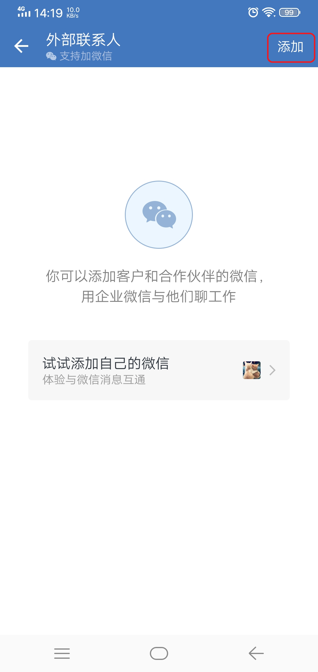 第三步,进入到外部联系人界面后,我们找到界面右上角的【添加】选项,并点击打开。