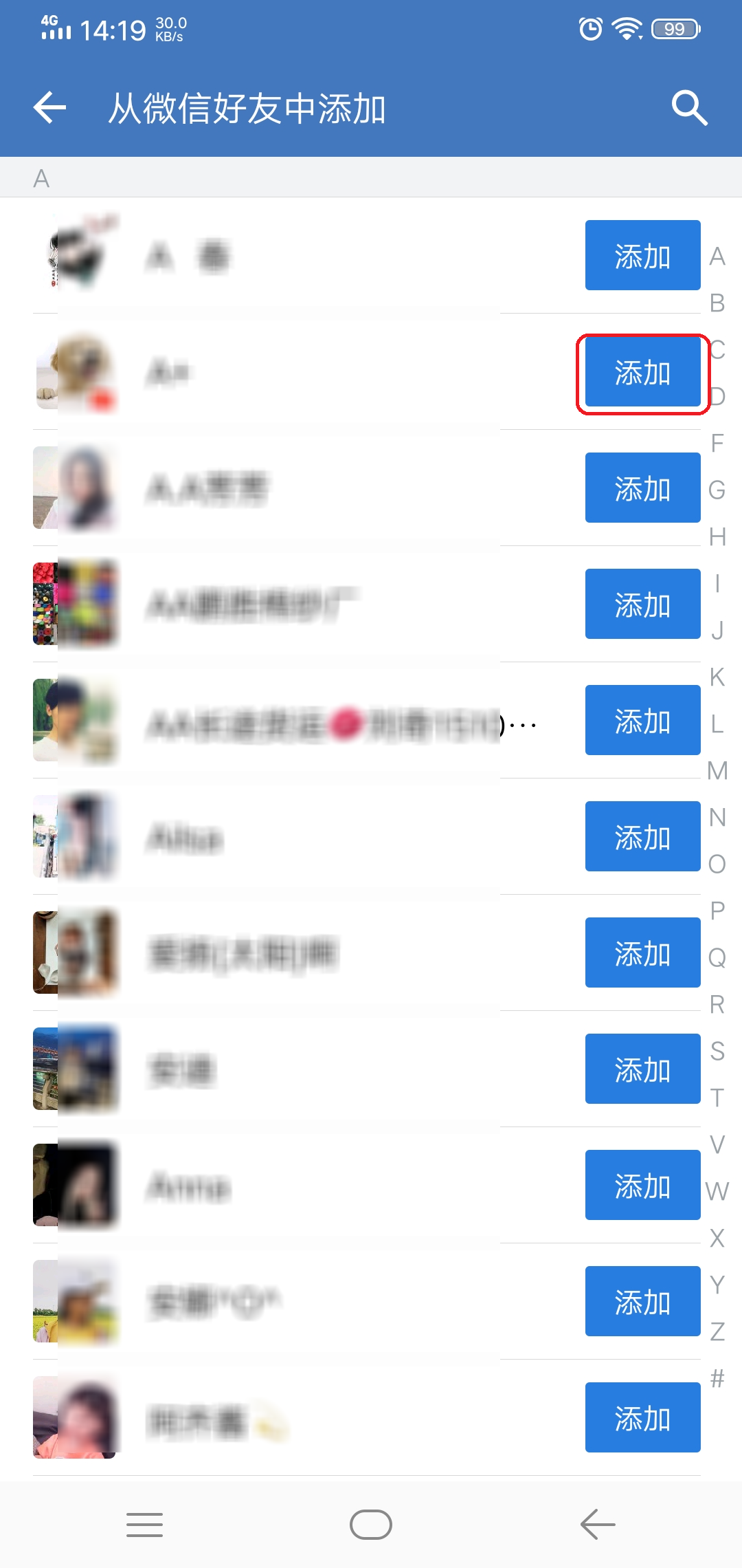 第五步,此时软件界面就会弹出你的微信好友列表了,我们找到需要添加的好友,然后点击好友右侧的【添加】按钮。