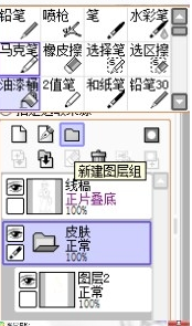 4:选中之后,就可以开始上色了,新建图层,【这里要注意哦,换一种颜色就必须再建一层,不然会糊掉】用油漆桶先大块大块地铺色。顺便新建一个文件夹,双击图层改个名找起来方便一点。然后将皮肤那图层拖进去。