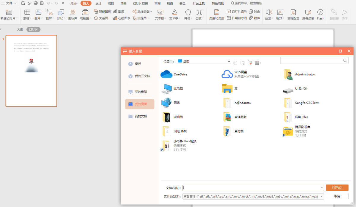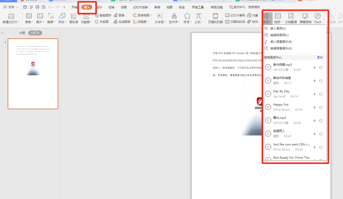 第一步:左键双击打开需要嵌入音视频的演示文稿。然后在菜单栏“插入“—”嵌入音频“,选择音频文件,文稿中会出现“小喇叭”图标