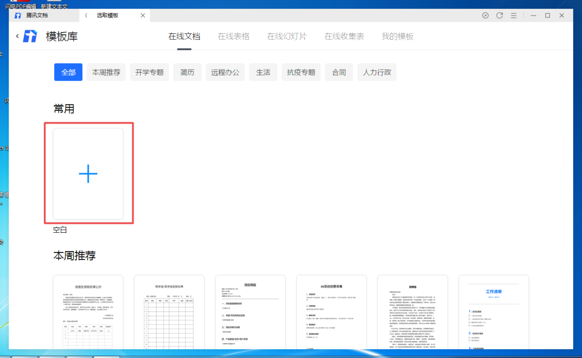 第三步,进入到在线文档的新建界面后,我们点击选择【空白】文档,然后进行新建。