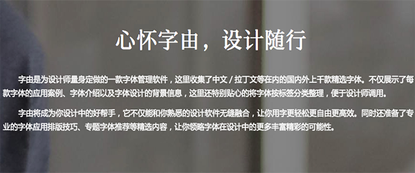 字由是一款不错的字体管理软件,设计师必备的工具,通过字库公司、字体类型、风格、用途以及语言分类筛选,快速的找到需要的字体,上面的字体都是设计师的无私分享,大部分字体是可以免费使用的。