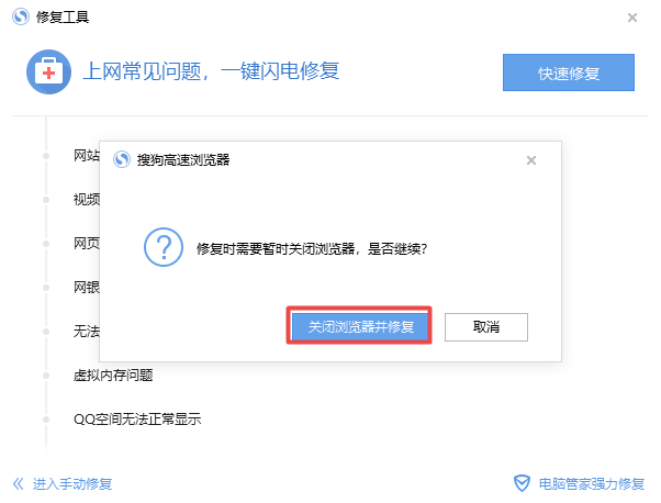 第四步,此时浏览器会弹出【修复时需要暂时关闭浏览器】的提示,直接点击【关闭浏览器并修复】按钮即可。最后浏览器修复成功后,我们就可以正常的打开网页了。
