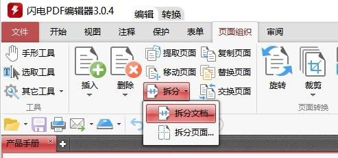 第二步,再也没按上方工具栏中找到“页面组织”,并点击下面的“拆分”,然后选择“拆分文档”。