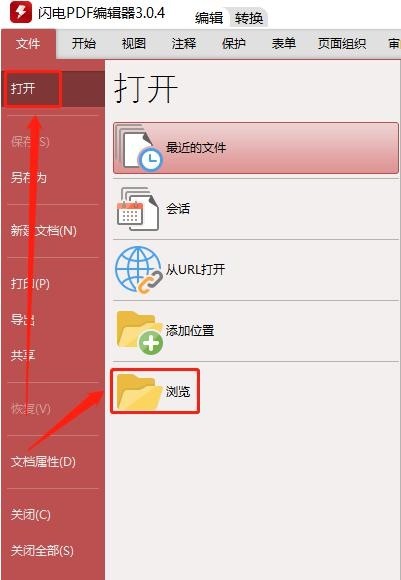 第一步,双击打开已经安装好的闪电PDF编辑器,点击“文件”里的“打开”,或者点击“新建文档”新建一个新的PDF文档。