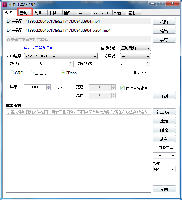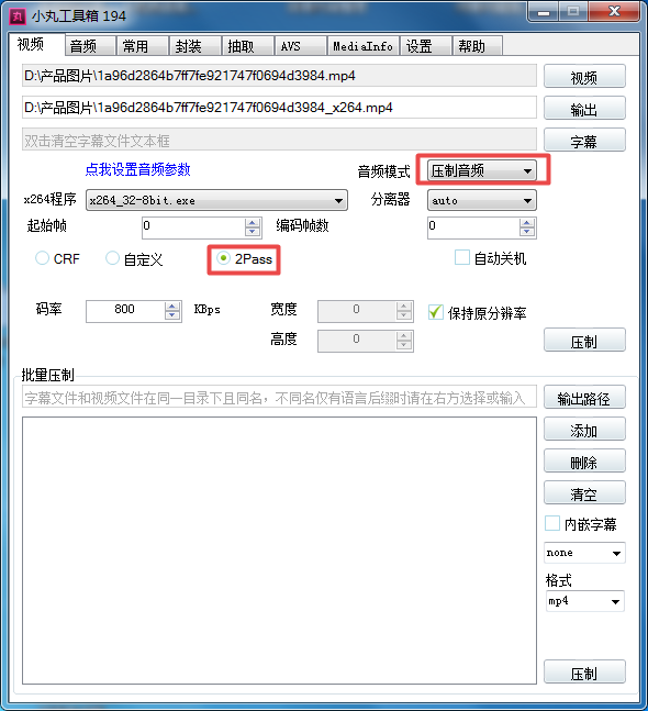 第三步,文件添加成功后,找到界面上的【音频模式】,将模式选为【压制音频】;我们勾选界面上的【2Pass】模式,采码率压缩。
