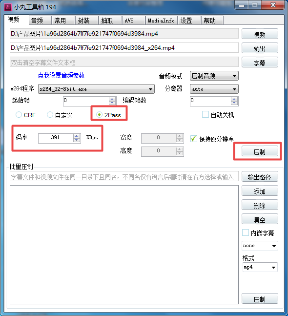 所以在本文中的视频,画面的码率=409kbps-16kbps=319kbps,所以我们在设置视频的画面码率时,将画面的码率填写为【391】,然后选择【2Pass】这个模式使用码率压缩,最后,点击界面右侧的【压制】就可以了。