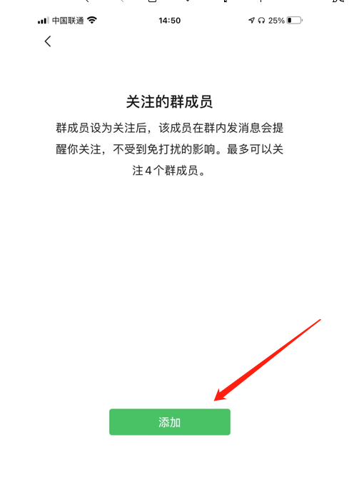 4. 进入到关注的群成员界面后,点击下方的添加。