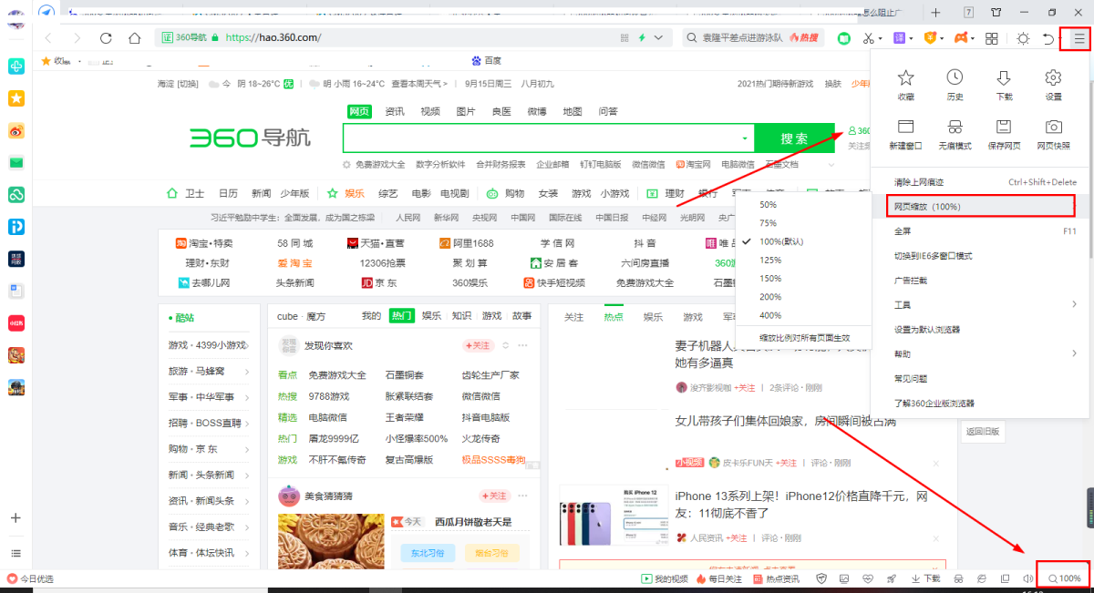 方法二:打开360安全浏览器后点击右上角的“打开菜单”选项,即三条横线图标——在弹出的菜单中选择“网页缩放”——默认比例为100%,根据自己需要放大或缩小页面即可;