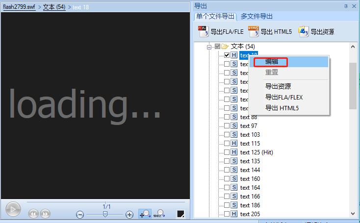 第二步,在软件页面的右侧,点开【文本】前面的【+】,鼠标右击其中一个元素,在下拉菜单中点击【编辑】选项。