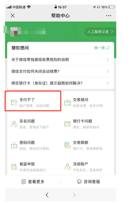 5. 进入到帮助中心的界面后,会看到有一个支付不了,然后点击它。