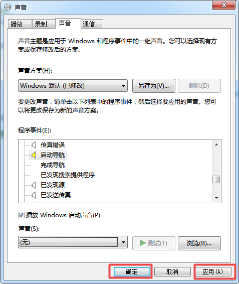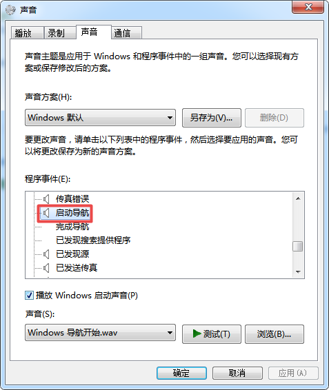 第四步,此时系统就会弹出【声音】的设置窗口,在此窗口下方的【程序事件】选项中,我们找到【启动导航】选项,并点击选择。
