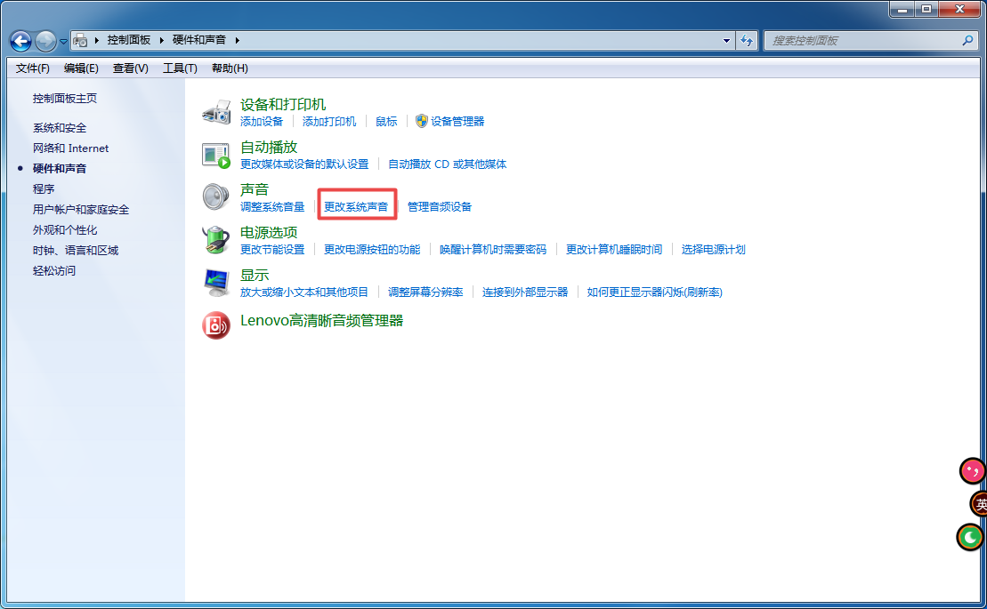 第三步,进入到电脑的硬件和声音设置界面后,我们在界面的右侧找到【声音】下方的【更改系统声音】选项,并点击打开。