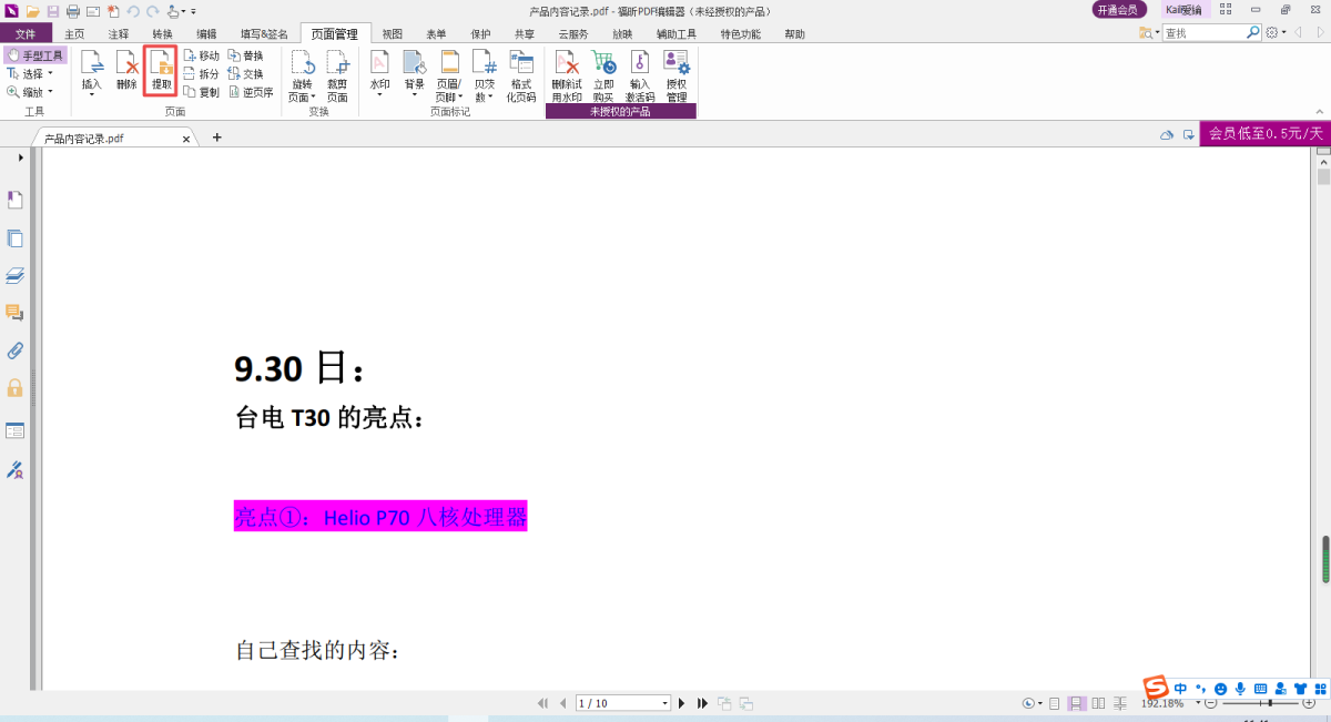 第三步,进入到软件的页面管理选项卡当中后,我们在其下方的功能中,找到【提取】功能,并点击打开。