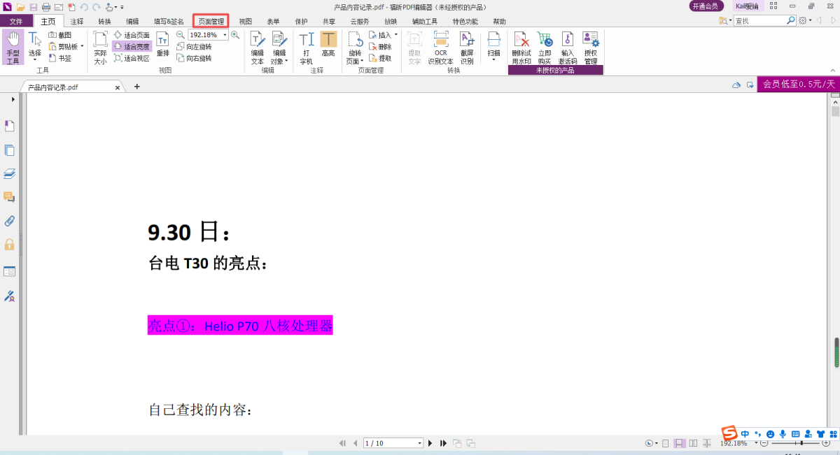 第二步,文档打开好以后,我们在软件顶部的工具栏中,找到【页面管理】选项卡,并点击打开。