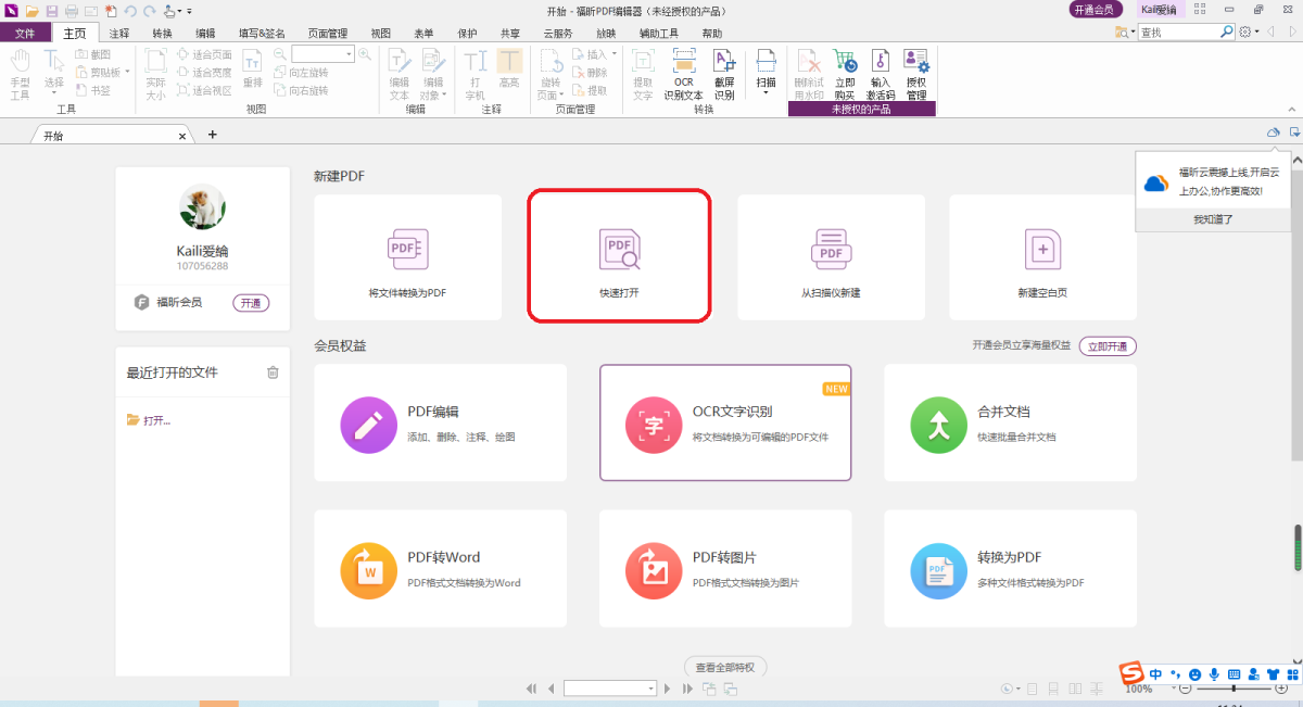 第一步,在电脑上下载并安装福昕PDF编辑器软件,软件安装好以后双击打开。进入到软件的主界面当中后,我们在界面上找到【快速打开】功能,然后将需要进行处理的PDF文档也同时打开。