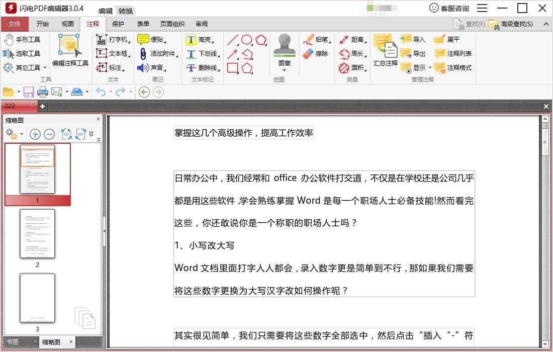 PDF文档应用越来越频繁,在强大的文件也弊端,而PDF文档的不足之处就是不容易编辑,必须得借助专门的PDF编辑器才可以。其实问题的根源在于PDF编辑器的选择,PDF编辑器选好了真能做到事半功倍,比如小编用的这款闪电PDF编辑器就非常好用。下面就用闪电PDF编辑器来给大家演示一下,PDF文档进行内容标注。
