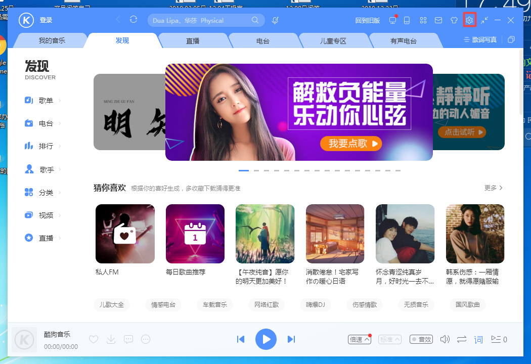 第二步,进入到酷狗音乐界面后,我们在界面的右上角找到【小齿轮】图标,并点击。