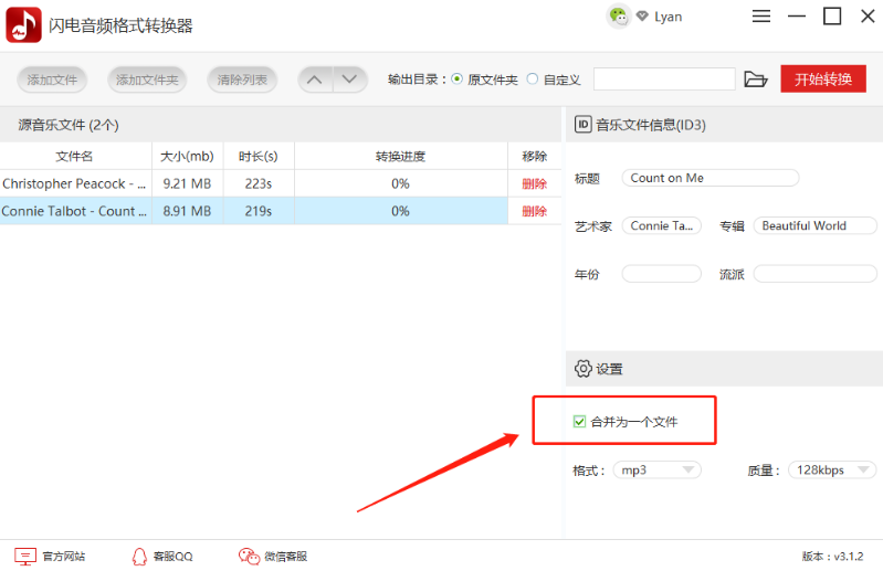 第二步,音频文件上传成功之后,勾选右下方的“合并为一个文件”。