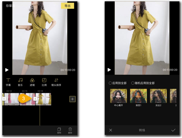 第二步,点击视频和图片中间的按钮插入转场,照片和视频就拼接在一起了。
