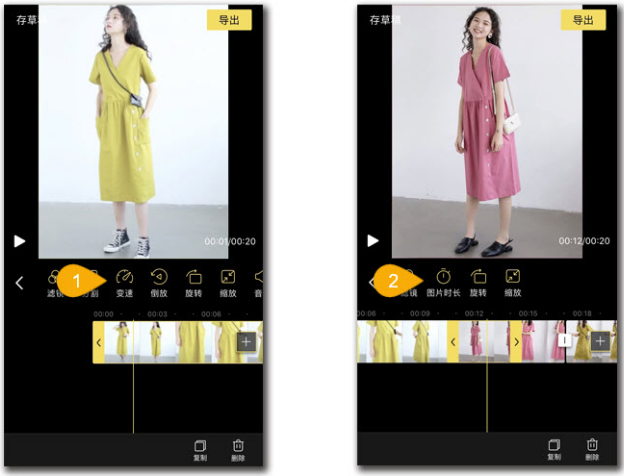第一步,打开蜜蜂剪辑软件进入编辑界面,点击“镜头排序”,用拖拽的方式来调整素材播放顺序,点击图片就能设置图片的播放时长,点击视频调整播放速度。