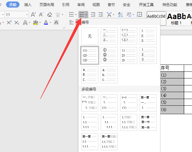 3、在菜单栏中,选择“开始----编号”,然后挑选需要的序号就可以了。