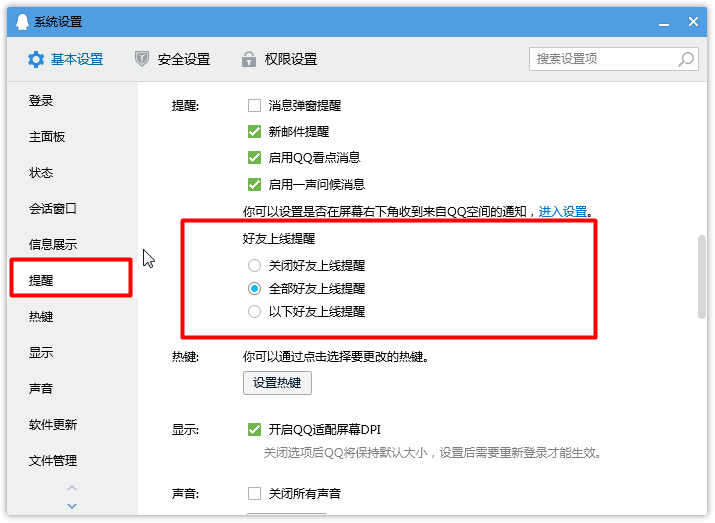 第四步,找到好友上线提醒项目,可以选择彻底关闭或者设定仅某些好友上线提醒。