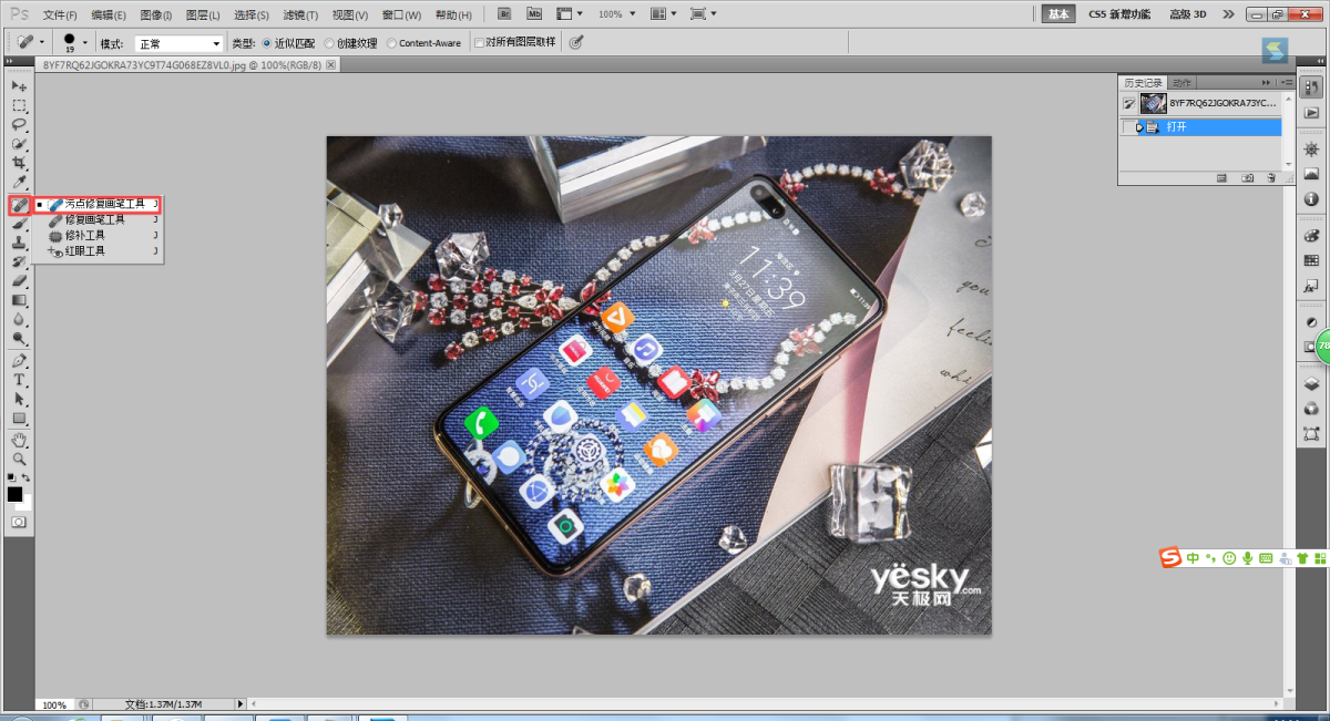 第二步,图片打开后,我们找到PS左侧工具栏当中的一个像创可贴的图片,然后鼠标右键,选择【污点修复画笔工具】。