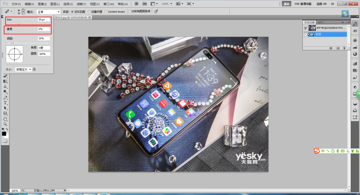 第三步,然后我们在软件界面的菜单栏当中,找到顶部的画笔设置,将画笔的大小设置为【55像素】左右,然后将【硬度】设置为0%,最后按下键盘上的回车键确定。