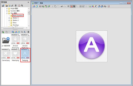 第三步,在“Blank Symbols”的文件夹中挑选一个带字母“A”的空白背景素材图片,也是直接拖拽到到工作区,把这两个素材叠加一下,一个带A字母的按钮图标就做好了。