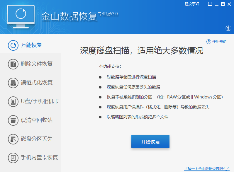 3、点击打开金山数据恢复大师,根据自己数据丢失的情况,选择具体的恢复类别,例如:误删除文件恢复;