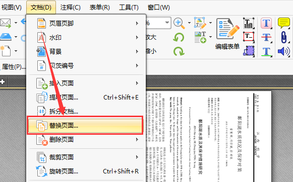 2.打开文件后,选择编辑器中菜单栏里的文档,然后选择文档中的替换页面工具,点击替换页面工具。