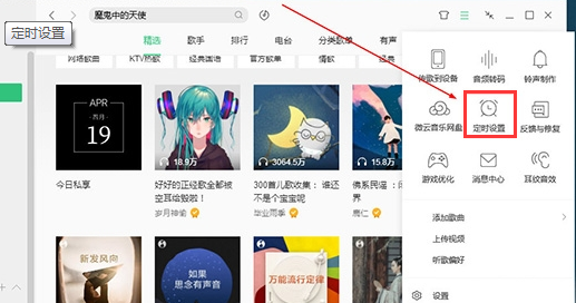 第一步,打开QQ音乐客户端,在主页面右上角的也换肤旁边有一个【设置】按钮,点击展开之后,选择【定时设置】选项。