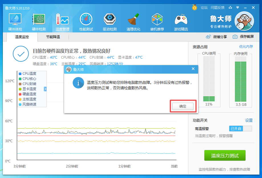 第五步,此时,会弹出一个提示框,提示我们【温度压力测试将会帮助你排除电脑散热故障,三分钟后没有过热警报,说明散热正常,否则请检查散热风扇】,这里点击【确定】按钮,就可以开始进行烤机测试了。