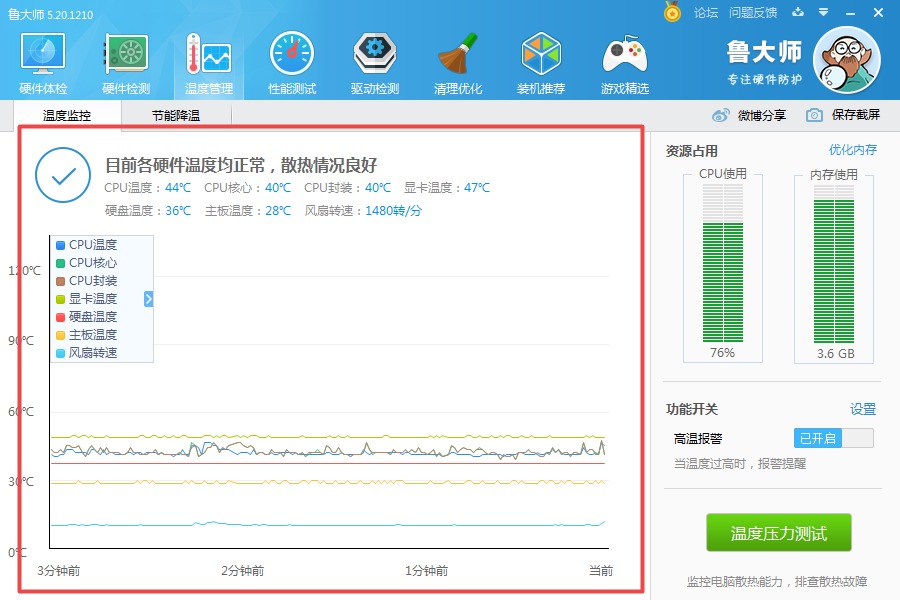 第四步,如果电脑的温度正常,散热情况良好,那么就点击界面右下角的【温度压力测试】按钮。