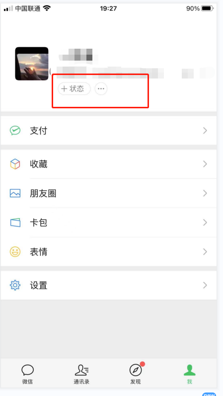 2、进入到此界面后,会看到上方微信号底下这里,有个+号状态,完后点击它。